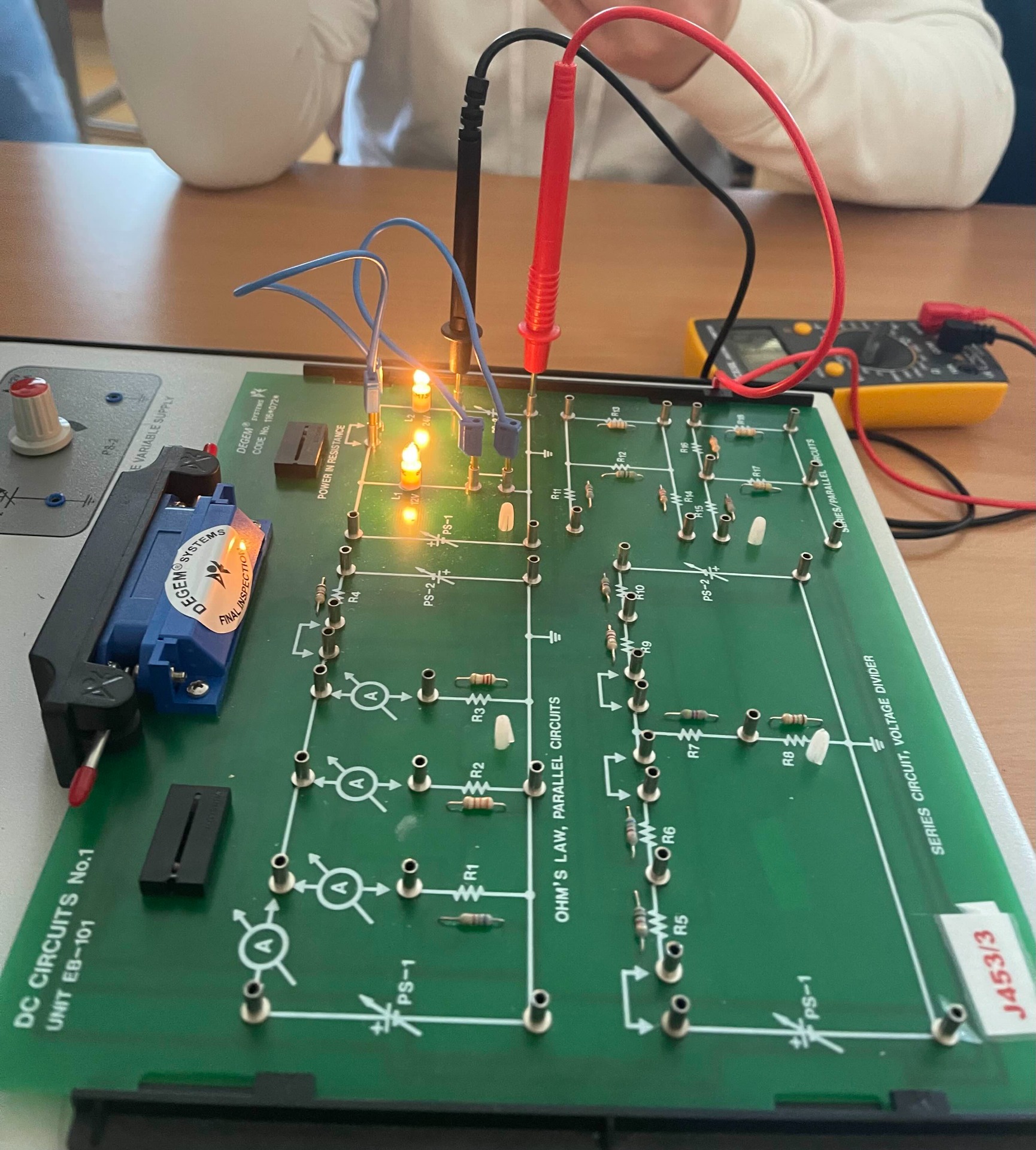 Először összekötöttük az áramkört hogy zárt legyen és összekötöttük a multimétert az áramkörrel. Utána feltekertük az potmétert ami át megy a kábelen az izzóba addig amíg világított. Utána meg néztük a mért feszültséget a multiméteren.